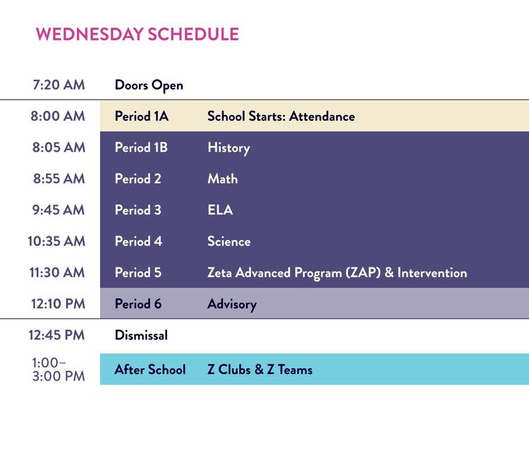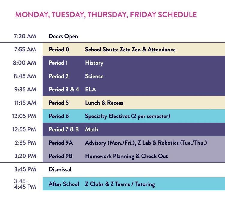 The schedule enables academic rigor, Advisory, Z Lab + Robotics, Specialty electives, and individualized supports.